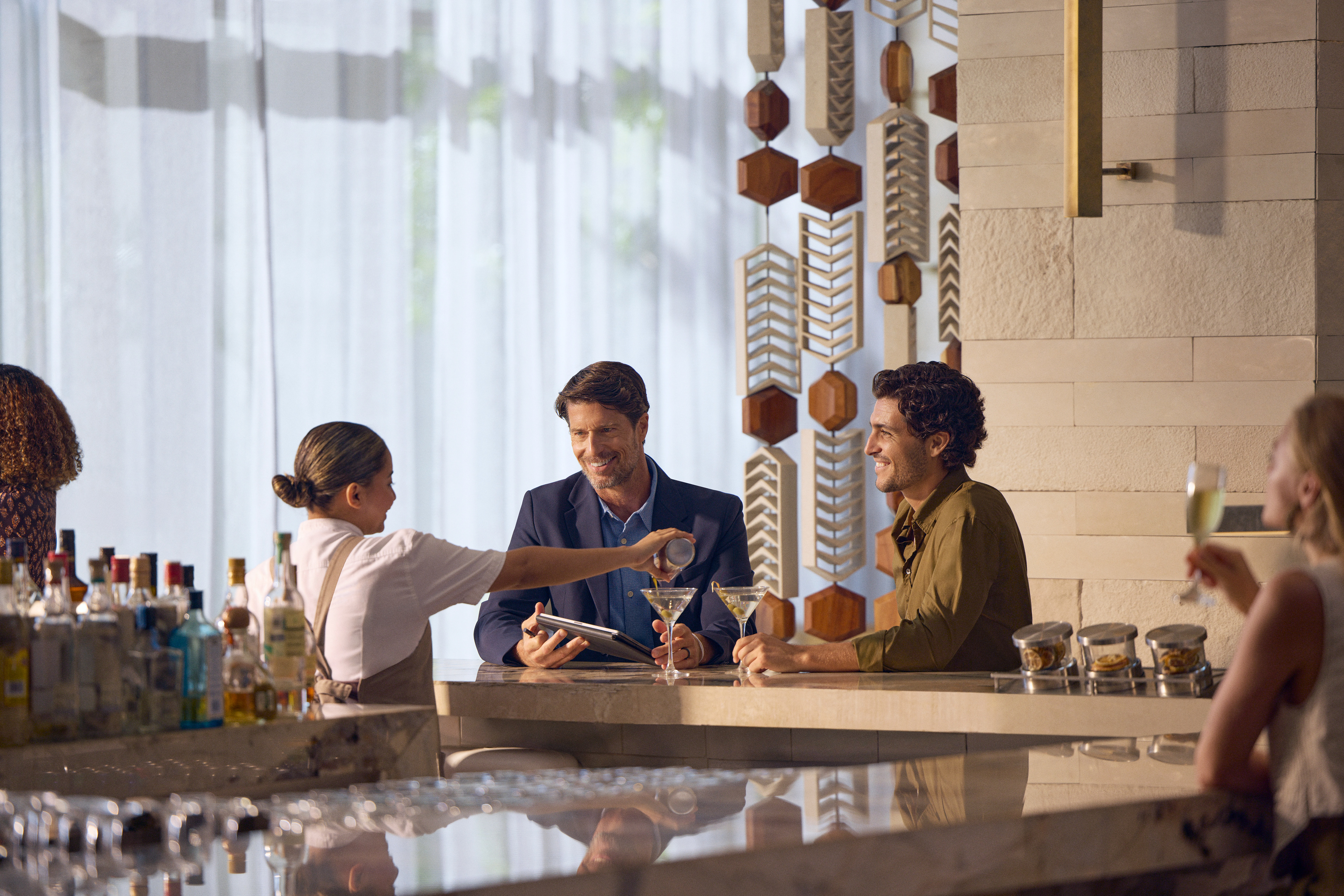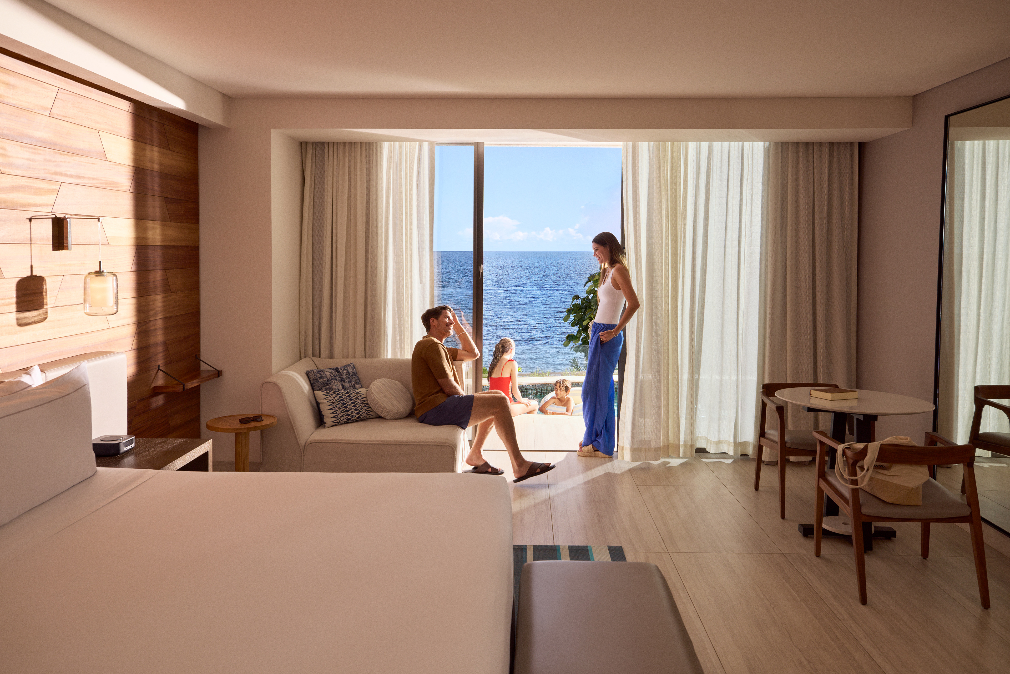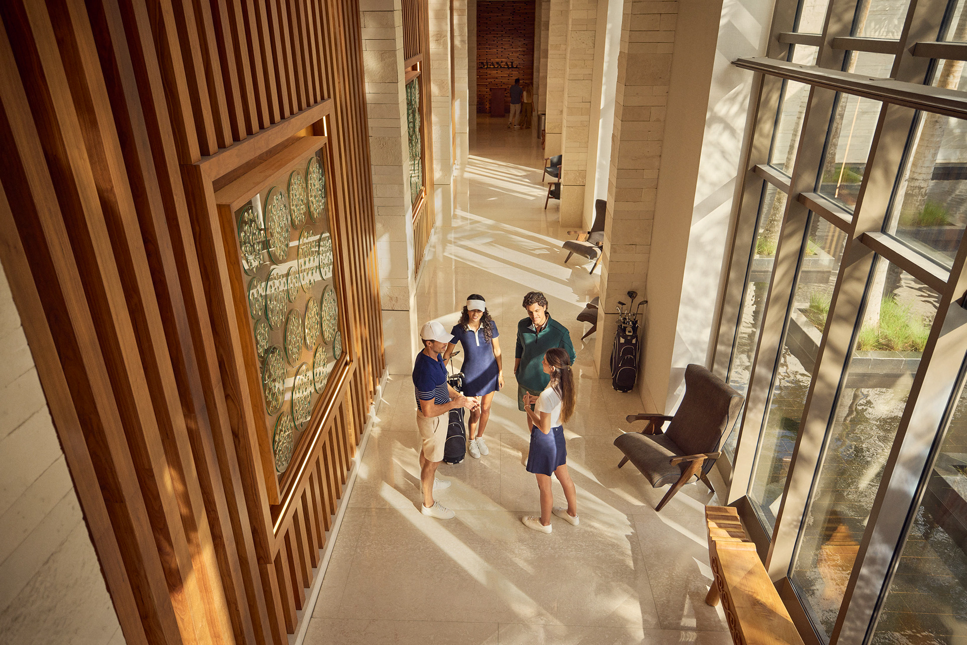 Two separate groups of guests are enjoying simultaneous stays: a family of four and a young couple. In order to include the hotel's request for business travel as well, we see some crossover in the groups as the men have "work drinks" and all the adults prepare for a round of golf (an affiliate golf course nearby is an offered amenity, but we were limited to only shooting on-property).