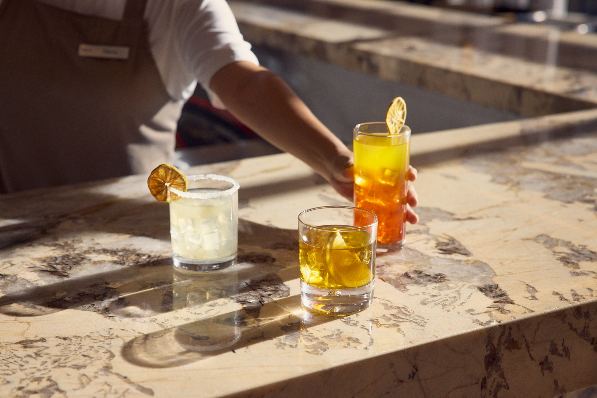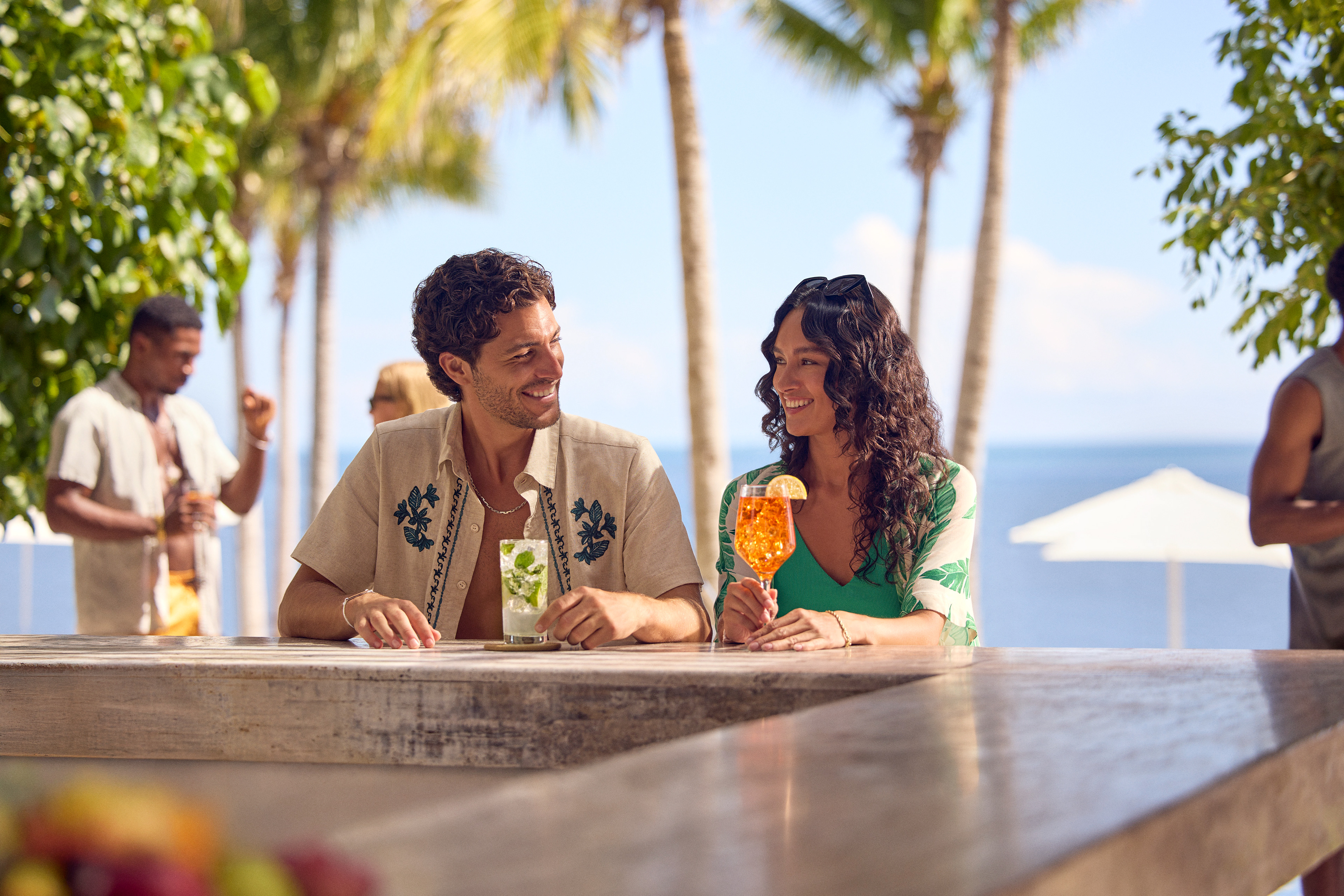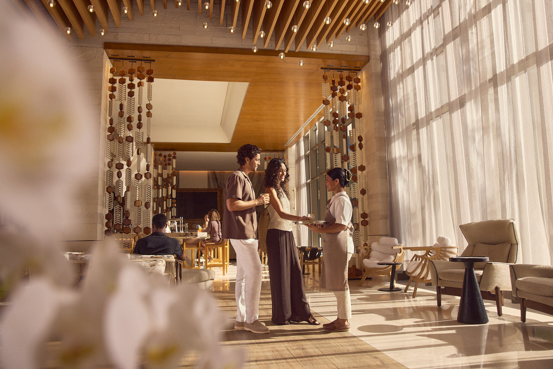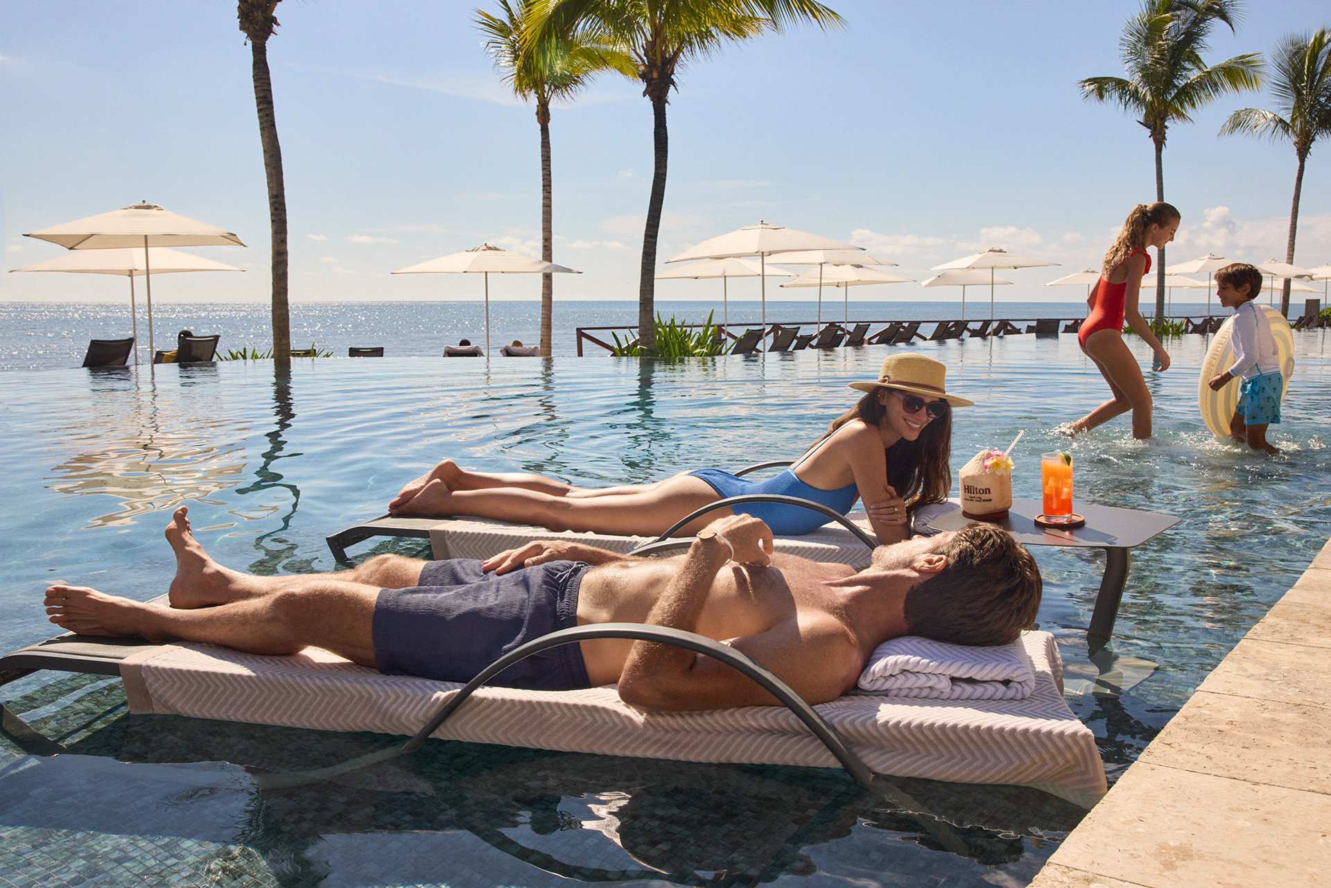 Two separate groups of guests are enjoying simultaneous stays: a family of four and a young couple. In order to include the hotel's request for business travel as well, we see some crossover in the groups as the men have "work drinks" and all the adults prepare for a round of golf (an affiliate golf course nearby is an offered amenity, but we were limited to only shooting on-property).